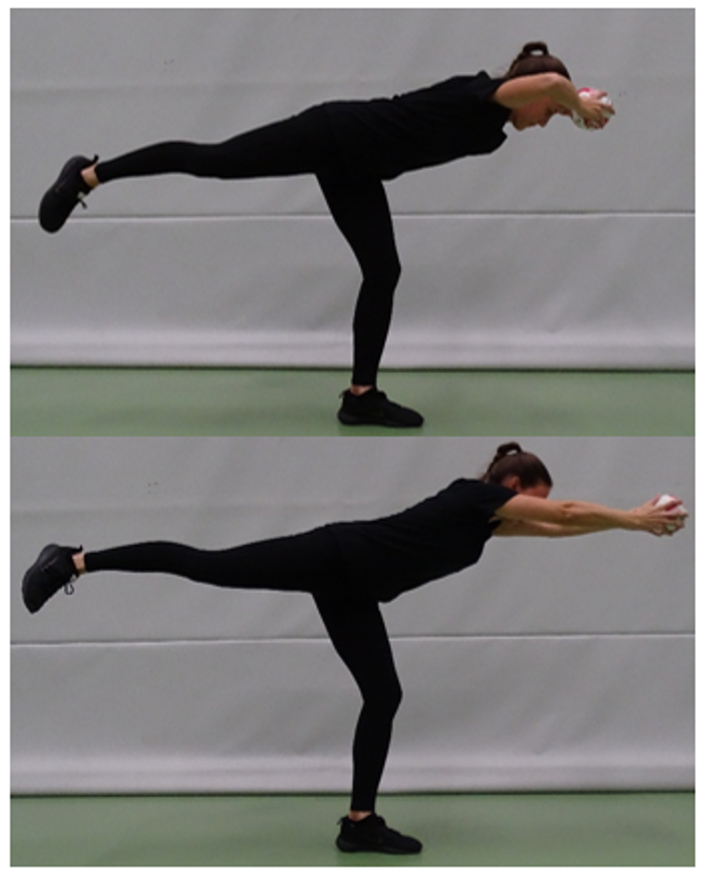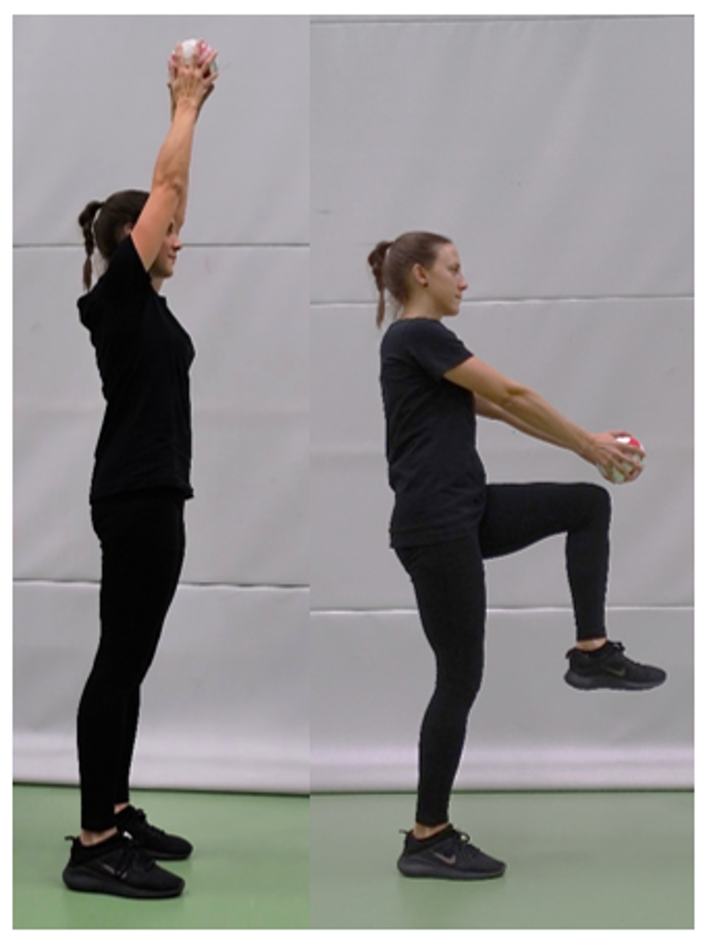 Auf einem Bein stehend. Das andere Bein ist gestreckt, der Oberkörper aufrecht. Arme waagerecht zum Boden (Ball haltend.)