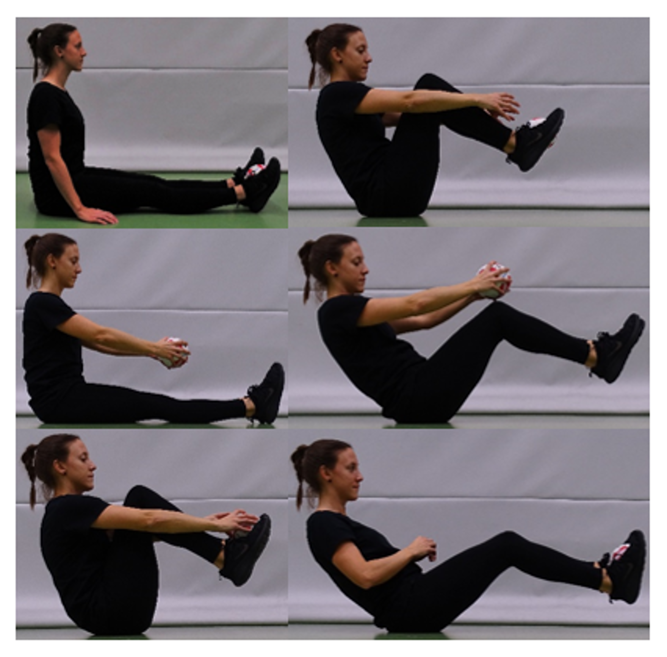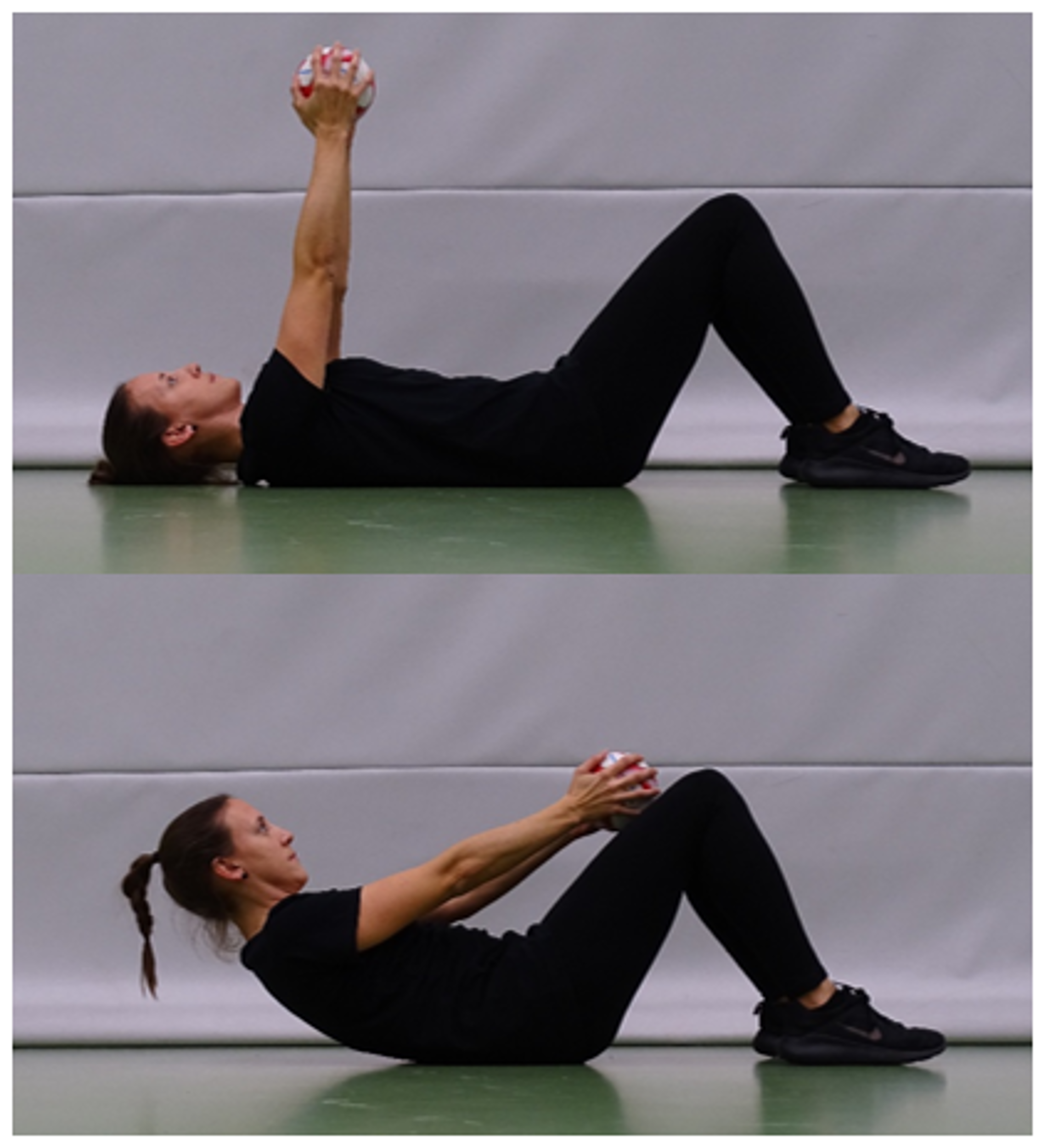 Der Ball wird mit gestreckten Armen und unter Anspannung der Bauchmuskulatur in Richtung der Knie geführt. Hierbei hebt der Oberkörper leicht vom Boden ab und wird anschliessend wieder abgesenkt, ohne dass die Schultern den Boden berühren. Die Lendenwirbelsäule behält Bodenkontakt.