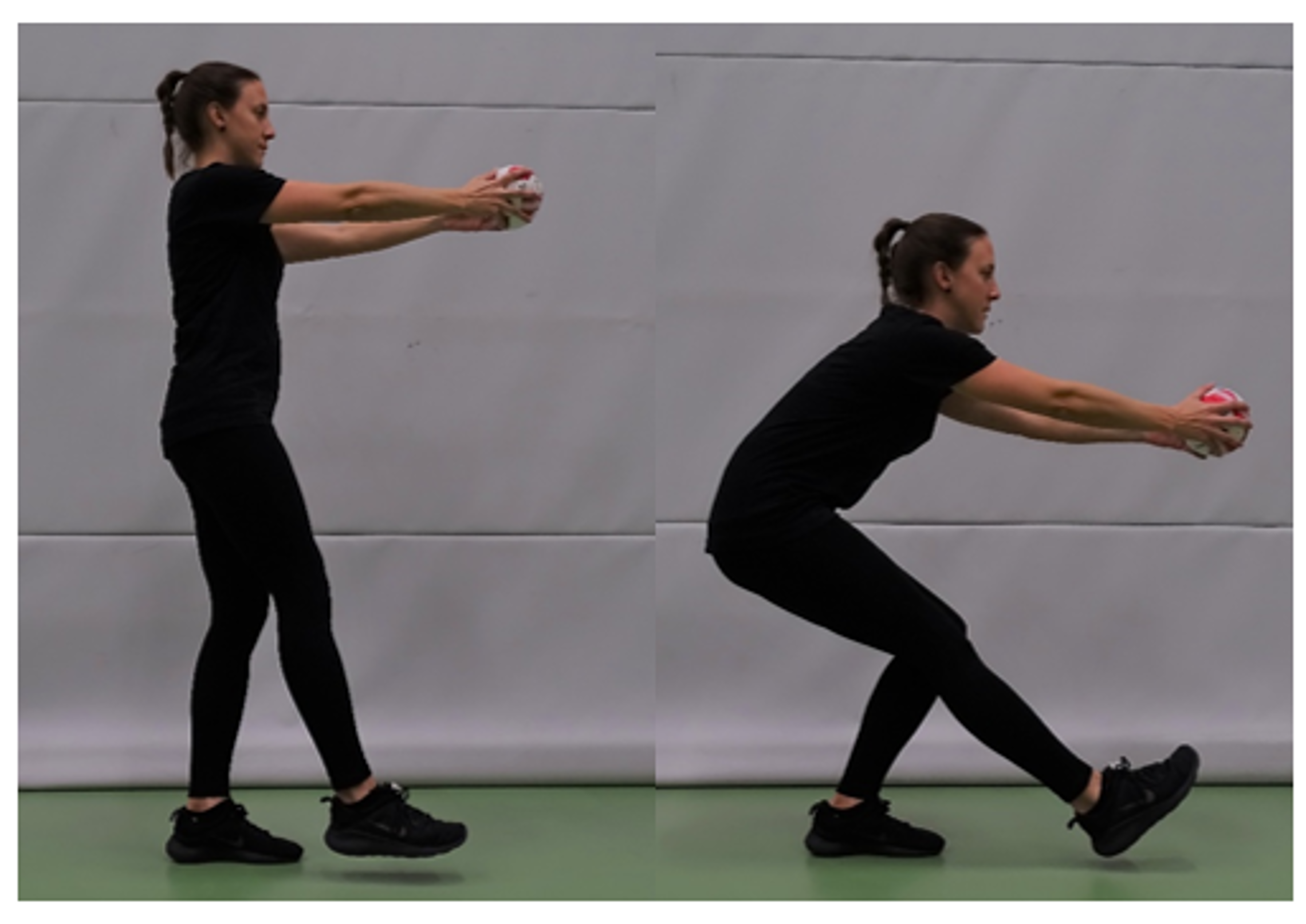 Hüftbreiter Stand mit ausgestreckten Armen parallel zum Boden (Ball haltend). Die Fussspitzen leicht nach aussen gerichtet.