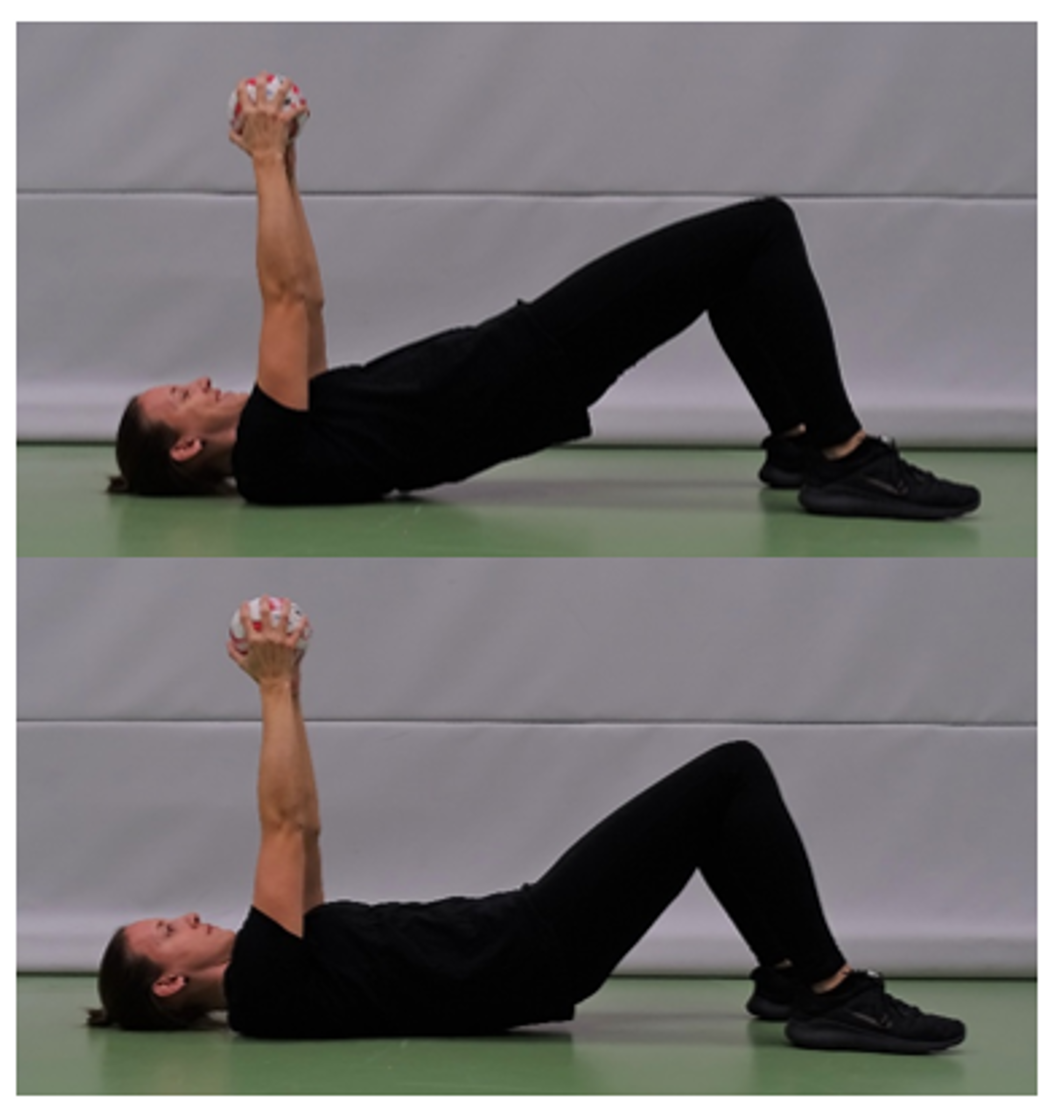 Ball zur Decke hoch drücken (Gesäss leicht anheben) und senken. Arme neben dem Körper unterstützen die Bewegung.