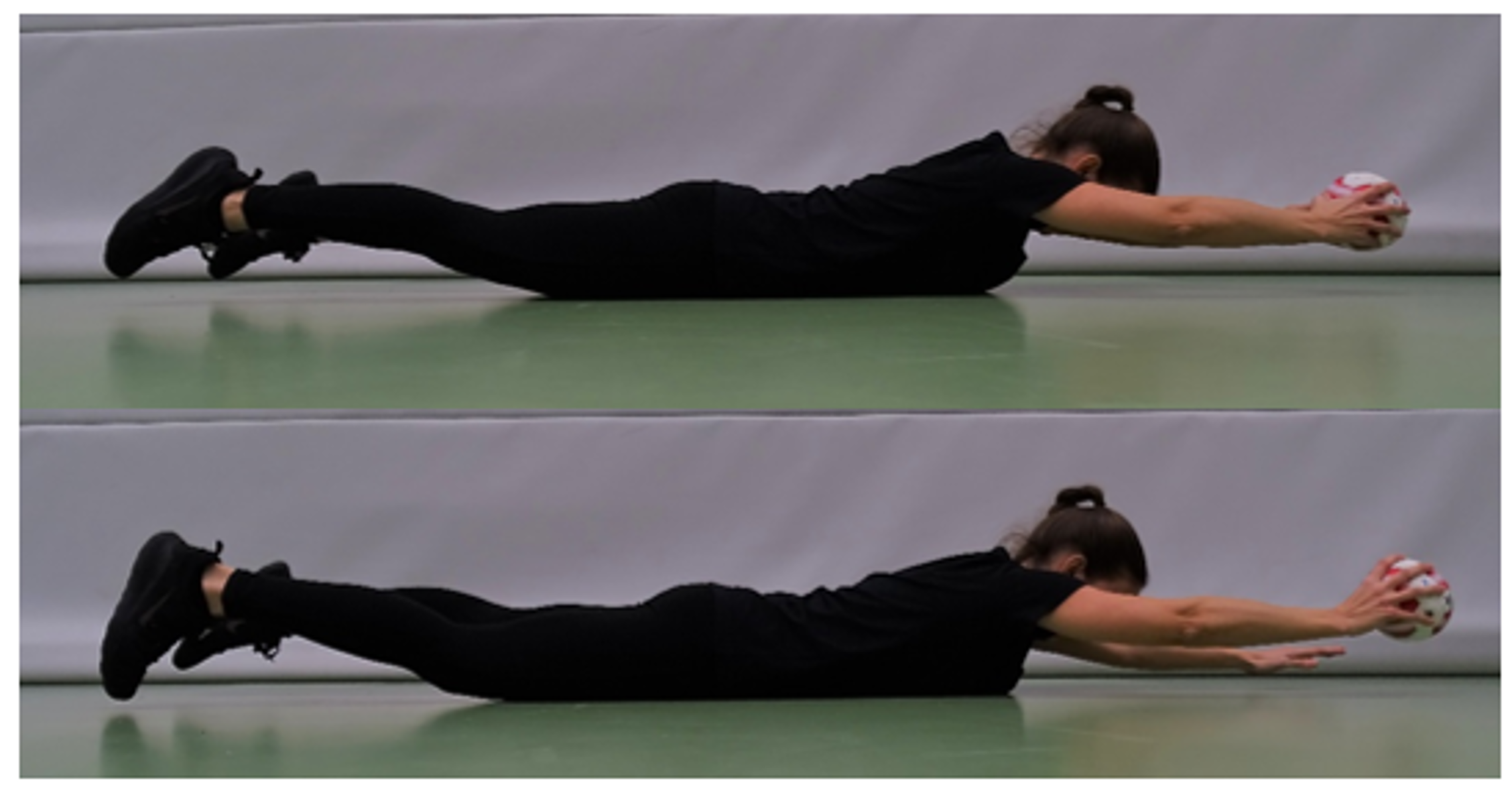 Bauchlage mit gestreckten Armen und Beinen. Beine und Arme 5-10 cm vom Boden abheben und Ball mit gestrecktem Arm parallel zum Boden halten. Der Rumpf ist angespannt und der Kopf in der Verlängerung der Wirbelsäule.