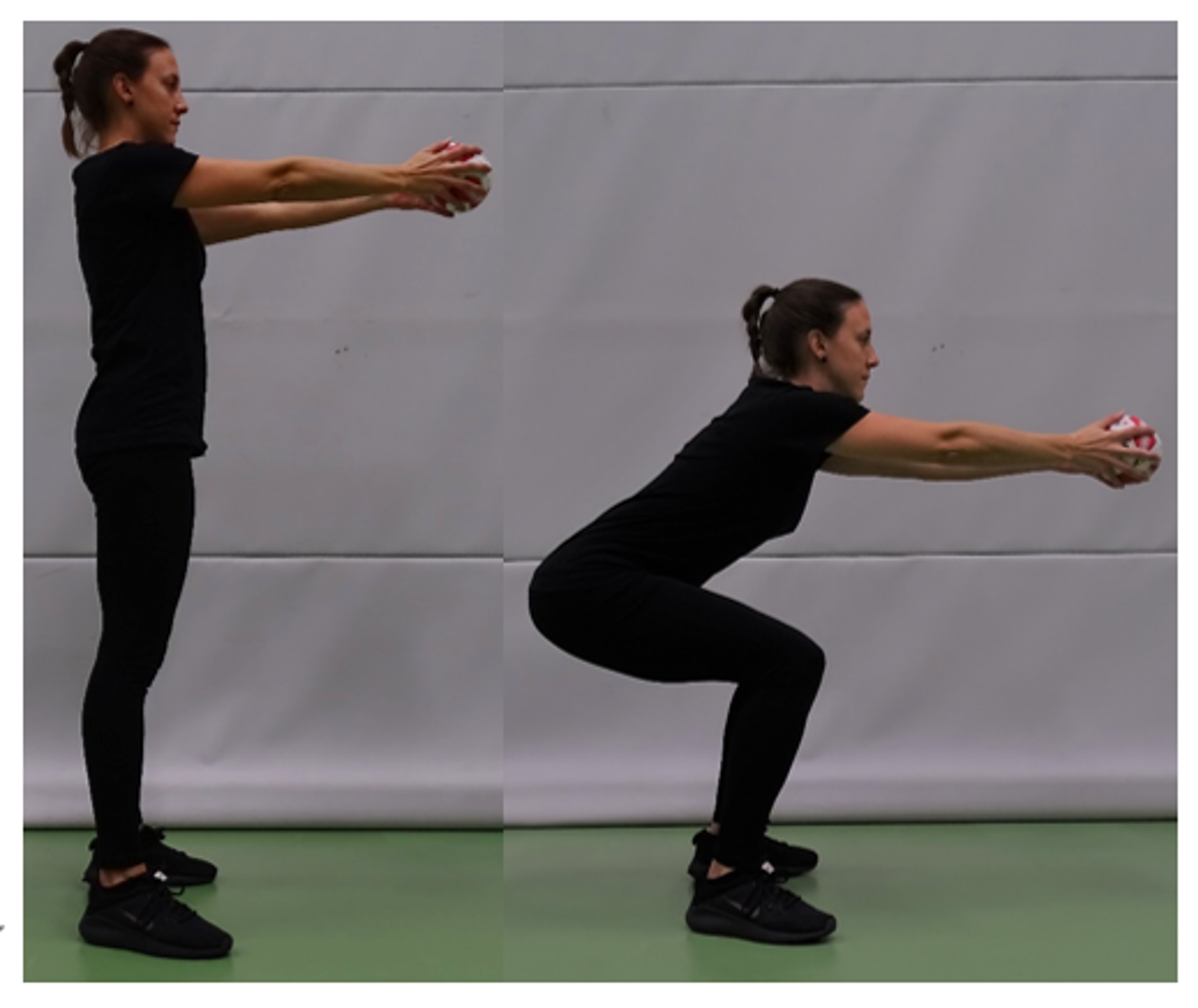 Hüftbreiter Stand mit hängenden Armen (Ball haltend). Die Fussspitzen leicht nach aussen gerichtet. Knie beugen (Vorstellung: auf eine imaginäre Bank absitzen) und Position halten.