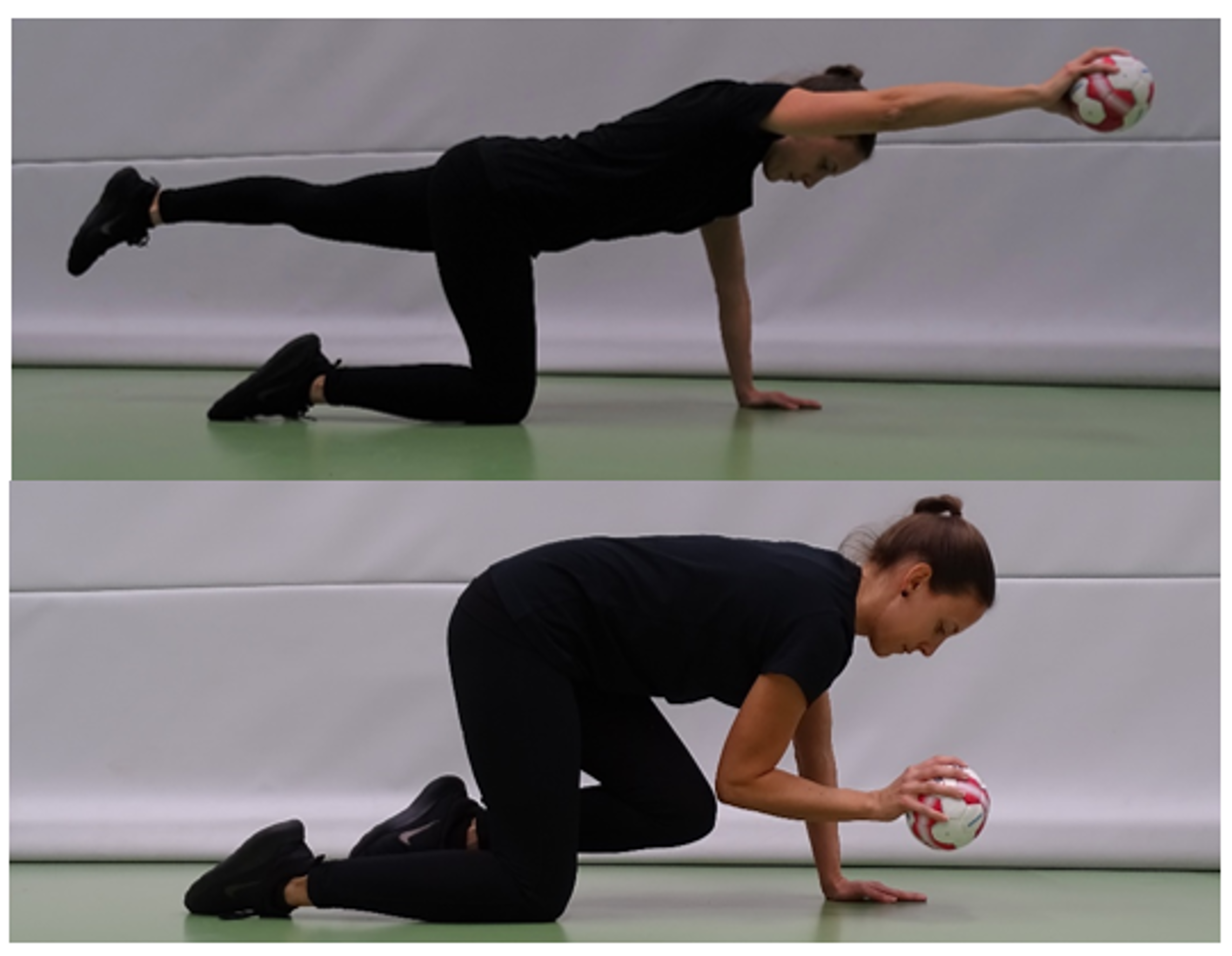 Hand (mit Ball) einen „Schritt“ nach vorne setzen und den Ball platzieren. Andere Hand holt den Ball und platziert ihn weiter vorne, usw. Bis zur Stützposition laufen und so den Ball nach vorne transportieren. Anschliessend mit den Beinen zu den Händen „nachlaufen“. Der Rücken bleibt gerade, die Hüfte stabil. Mit Beinen nach vorne zu den Händen laufen.