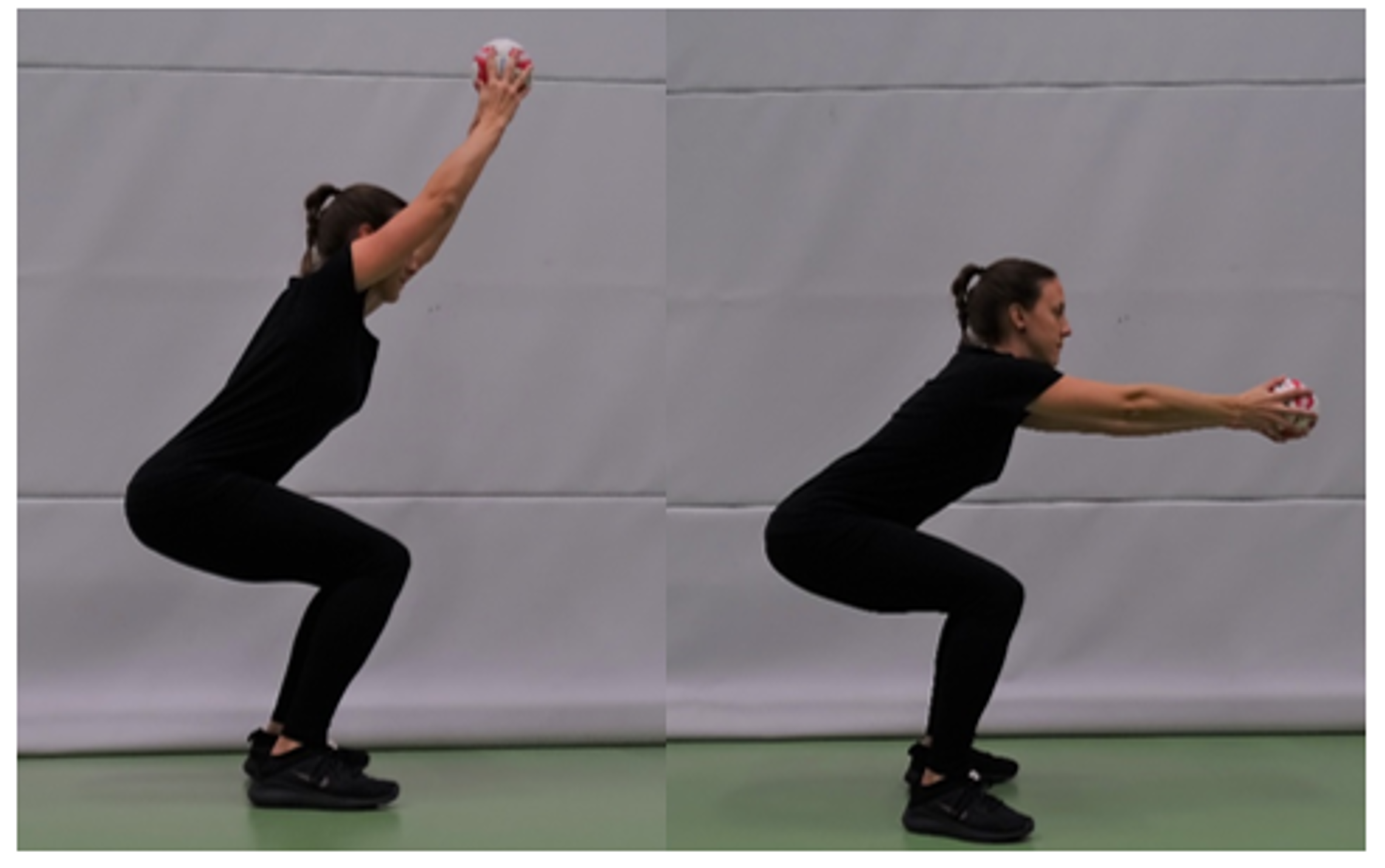 Hüftbreiter Stand, Gesäss senken und 90 Grad-Winkel in den Knien. Gerader Rücken und Arme in Verlängerung nach oben (Ball haltend).