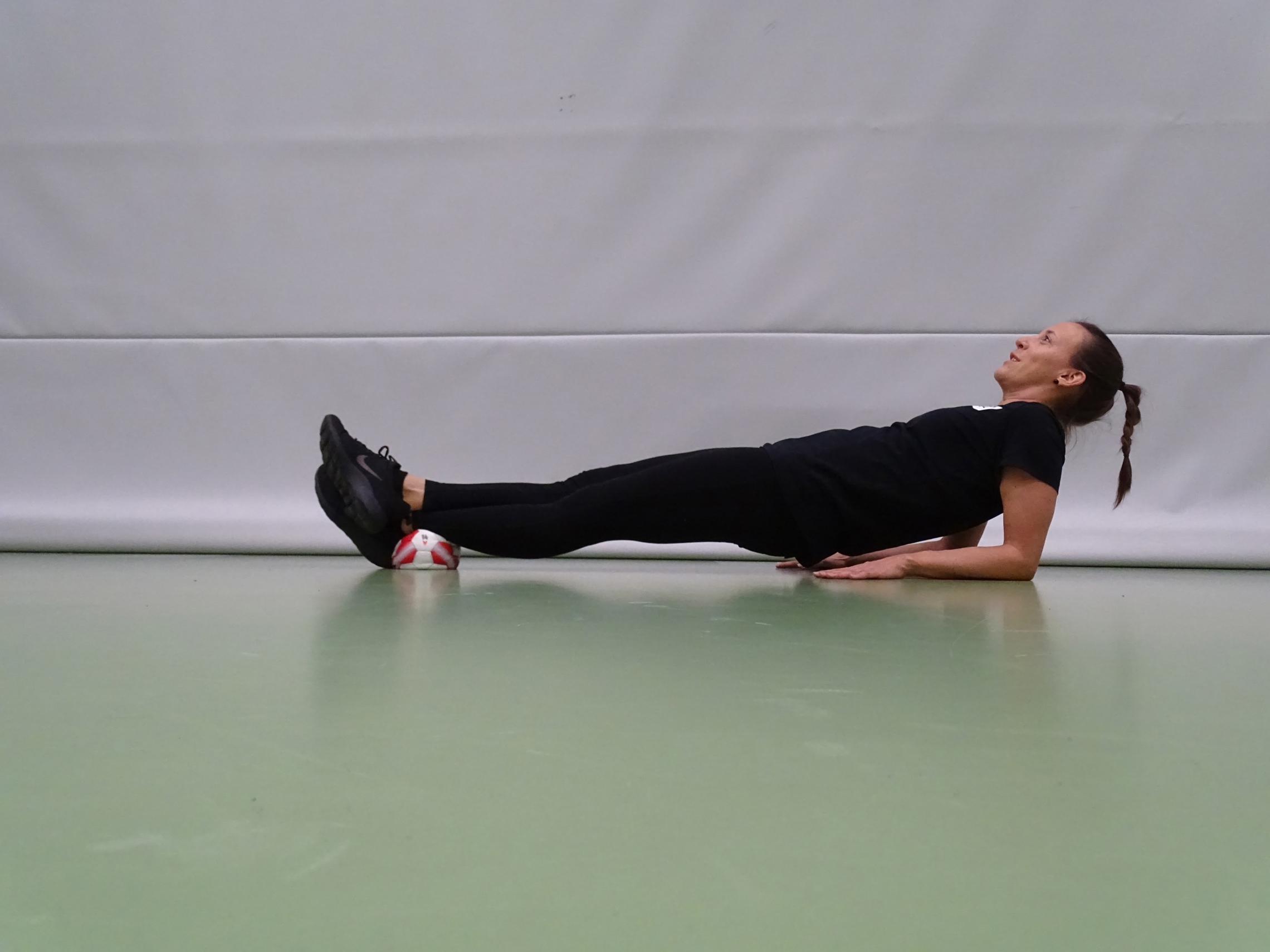 Unterarmstütz rückwärts. Beine gestreckt und überkreuzt und stützen auf dem Ball (Höhe Fussgelenke) ab. Der Kopf befindet sich in der Verlängerung der Wirbelsäule.