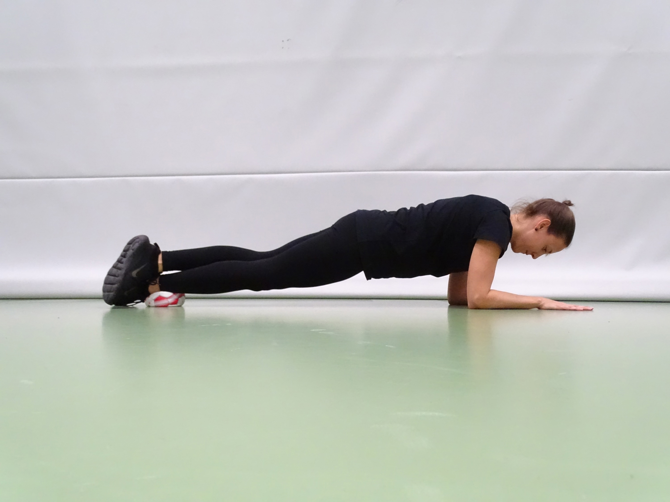 Unterarmstütz. Der Körper ist gestreckt und der Rumpf ist angespannt. Die Hände befinden sich auf Schulterhöhe und der Kopf in der Verlängerung der Wirbelsäule. Die Beine sind überkreuzt und stützen auf dem Ball (Höhe Fussgelenke).
