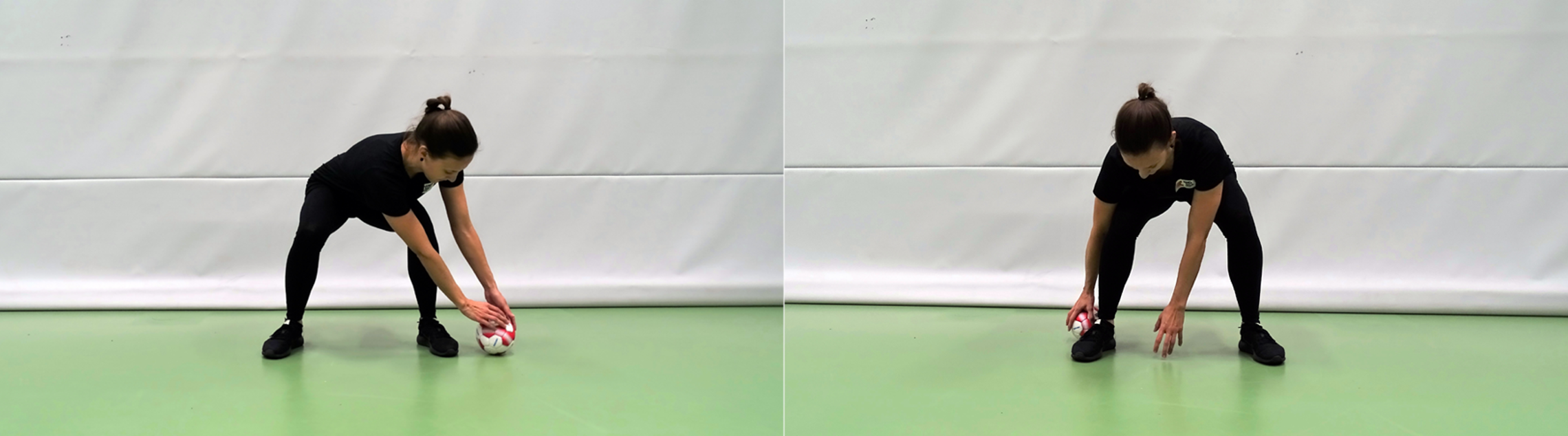 Einen breiten Ausfallschritt zur Seite. Und dabei das Knie beugen. Den Schritt zur Seite möglichst gross ausführen. Das Kniegelenk ist am Ende max. auf gleicher Höhe wie die Fussspitze. Dabei die Arme zur Seite führen und den Ball übergeben.