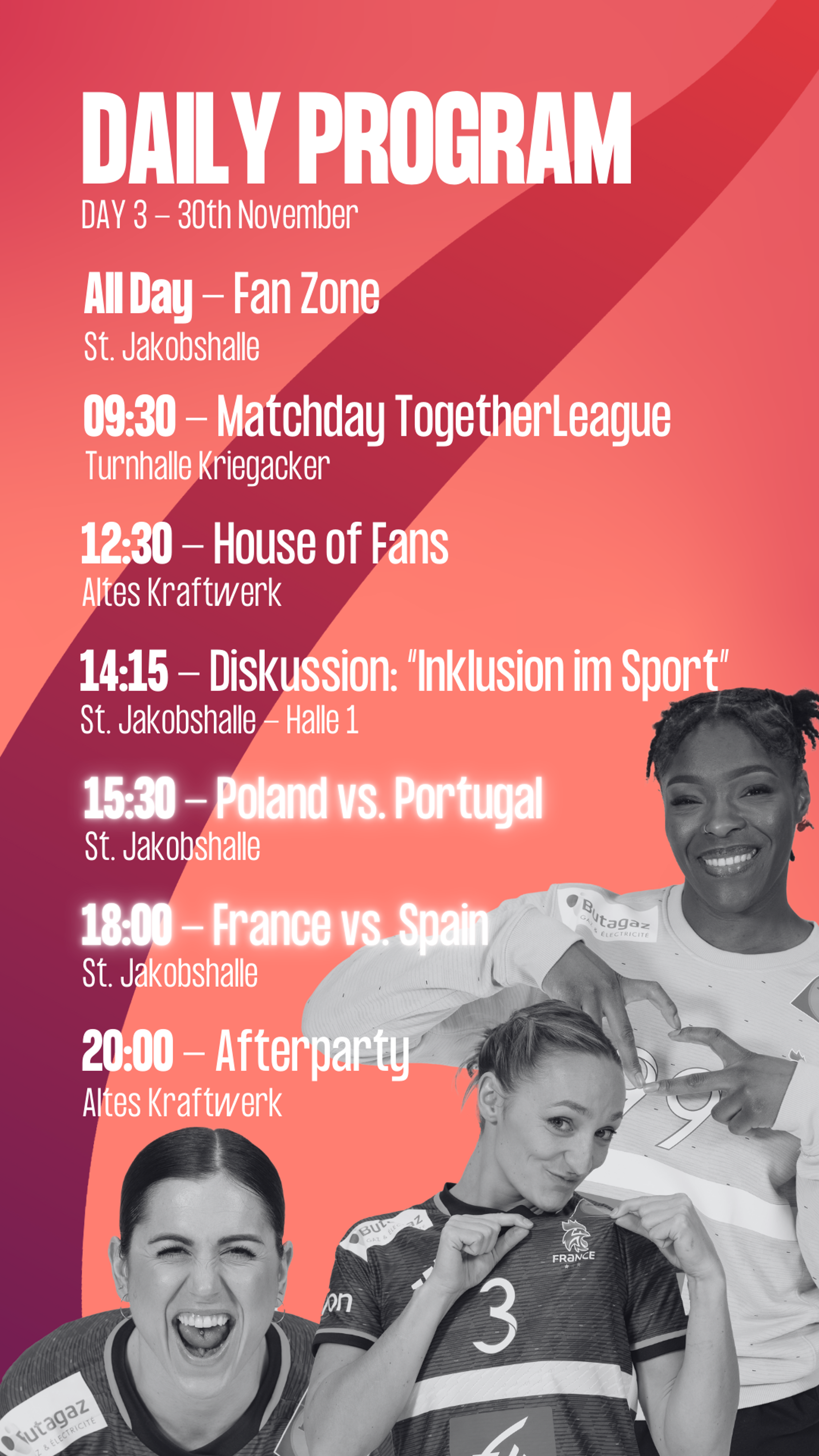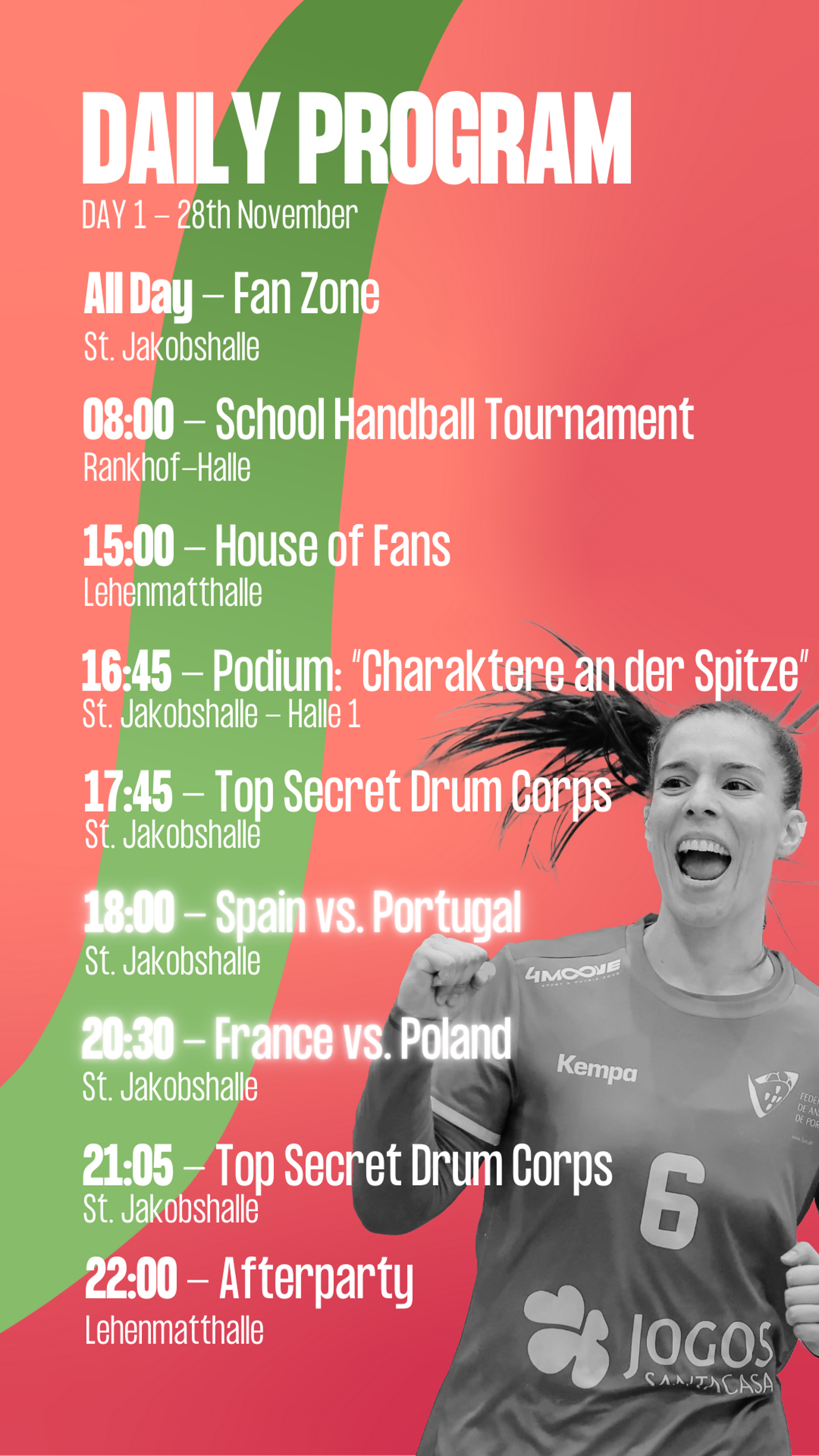 Die Schweiz, aber auch ihre Gegnerinnen der Färöer-Inseln, aus Dänemark und Kroatien, erwartet eine grossartige Atmosphäre in der St. Jakobshalle. In der Gruppe C treffen die Weltmeisterinnen aus Frankreich auf Spanien, Portugal und Polen. Auch hier ist der Spieltag vom Samstag, 30. November, bereits mit einer rund 75-Prozent-Auslastung mehr als gut besucht.