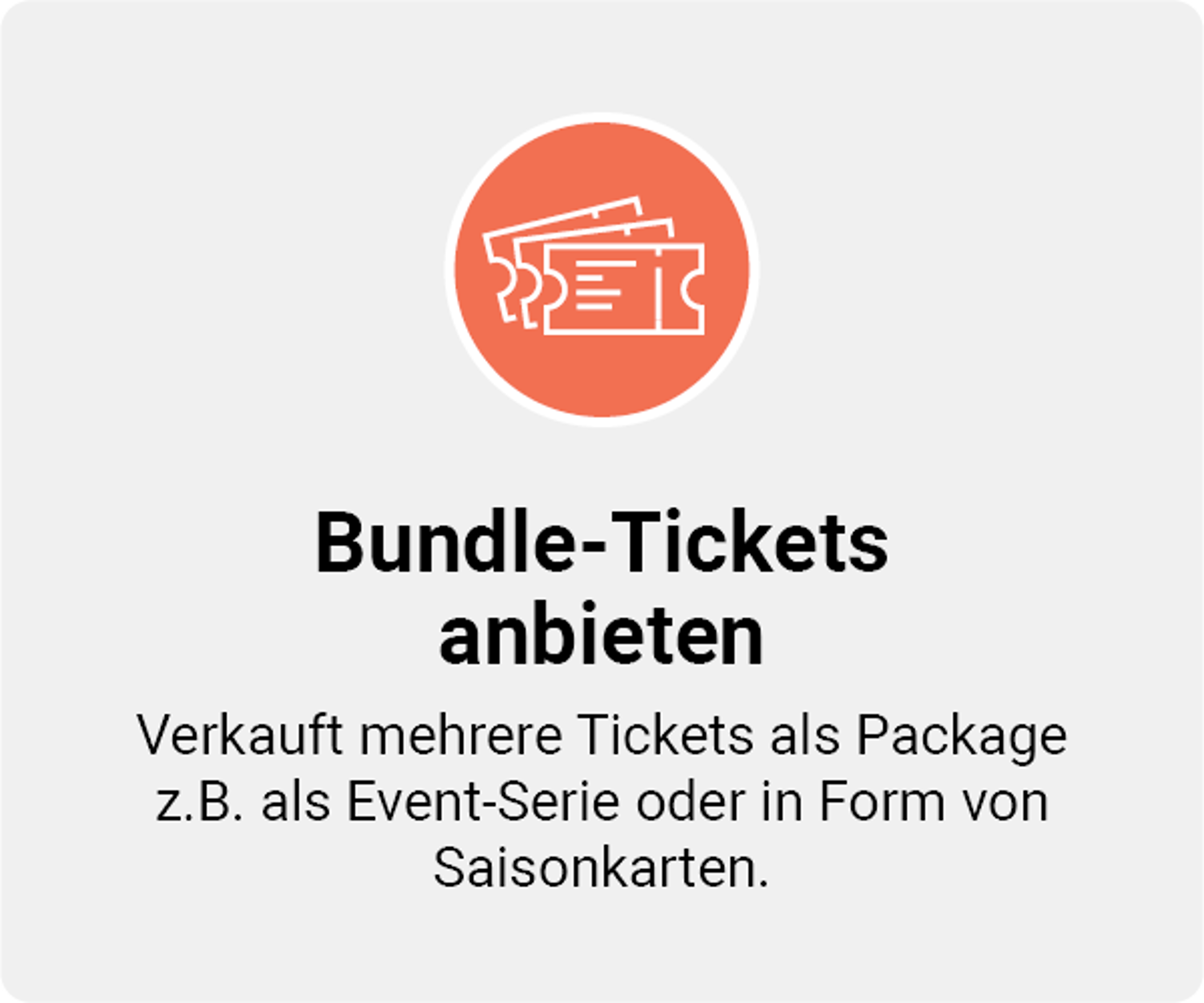 Mit dem Event-Bundle-Feature kannst du bis zu 30 Einzelevents zu einem Packet zusammenfassen. Kombiniere somit mehrere Veranstaltungen als Event-Serie, beispielsweise für Spieltag-Serien, als Abo-Lösung oder als Saisontickets.