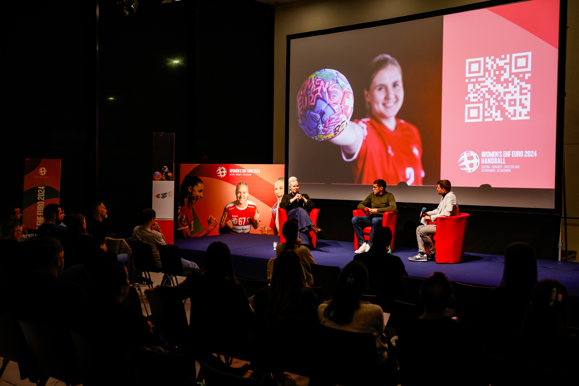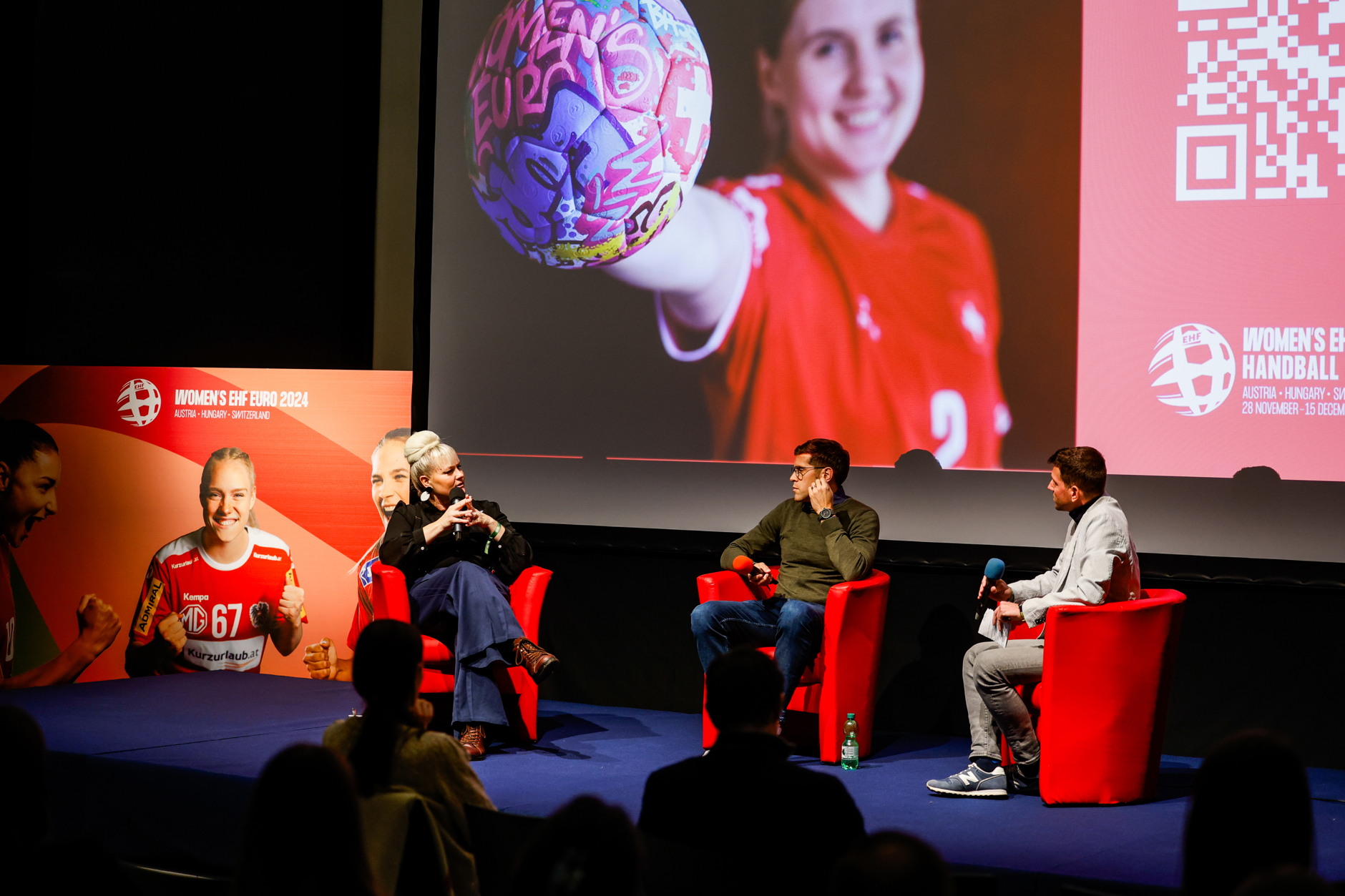 Pascale Bruderer, ancienne handballeuse, politicienne et entrepreneuse, Sandra Banholzer (CEO Rausch), Katja Murmann (WolfPak.ai) et l'entraîneur national Andy Schmid lors de la table ronde VIP dans le cadre du Women's EHF EURO 2024 à Bâle (28 novembre).