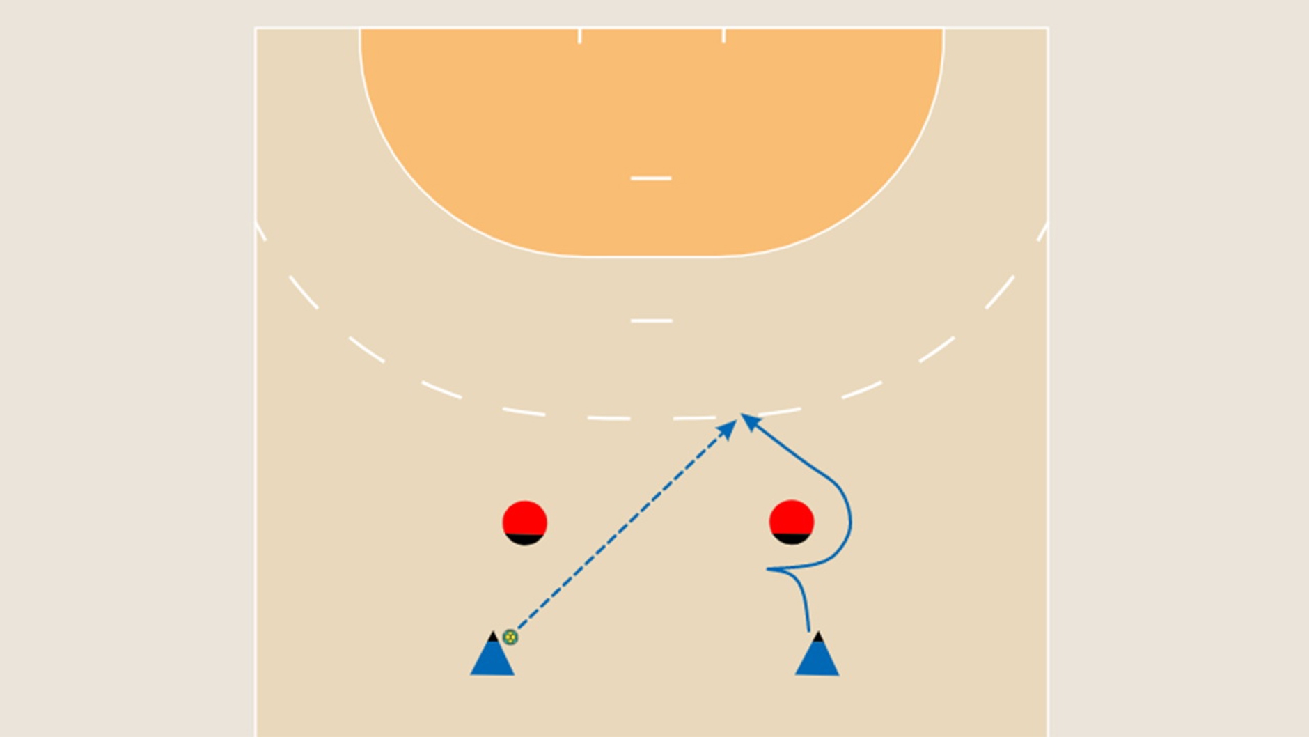 Aufbauend auf der individuellen Handlungskette (Raum öffnen – Anbieten – Umspielen) entwickelt sich das erste kooperative Verhalten im Angriff. Ein erfolgreiches Umspielen vom Angreifer mit Ball (gegen den ersten Abwehrspieler) kann von der Abwehr durch Helfen (durch einen zweiten Abwehrspieler) gestoppt werden. Angreifer ohne Ball müssen die dadurch frei werdenden Räume erkennen und im richtigen Timing (ohne in den Passschatten zu gelangen) anlaufen.
