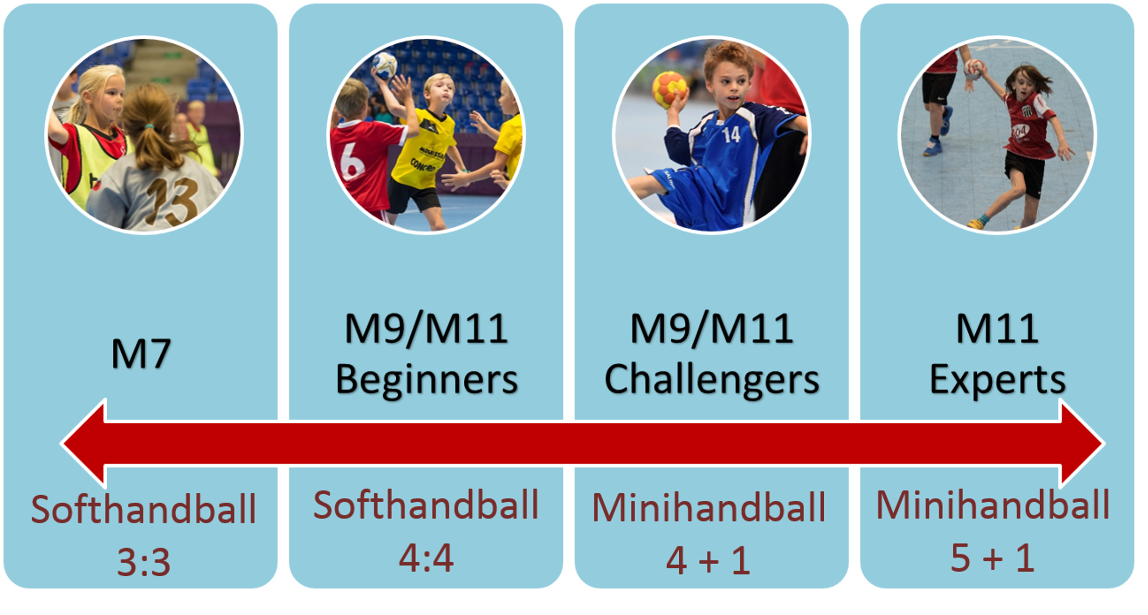 En même temps, les plus jeunes peuvent s'initier au sport de handball - grâce à des règles simplifiées, des ballons et buts adaptés. En découvrant le softhandball et le minihandball, filles et garçons seront amenés progressivement vers le jeu final «handball» - sans jamais s'ennuyer.